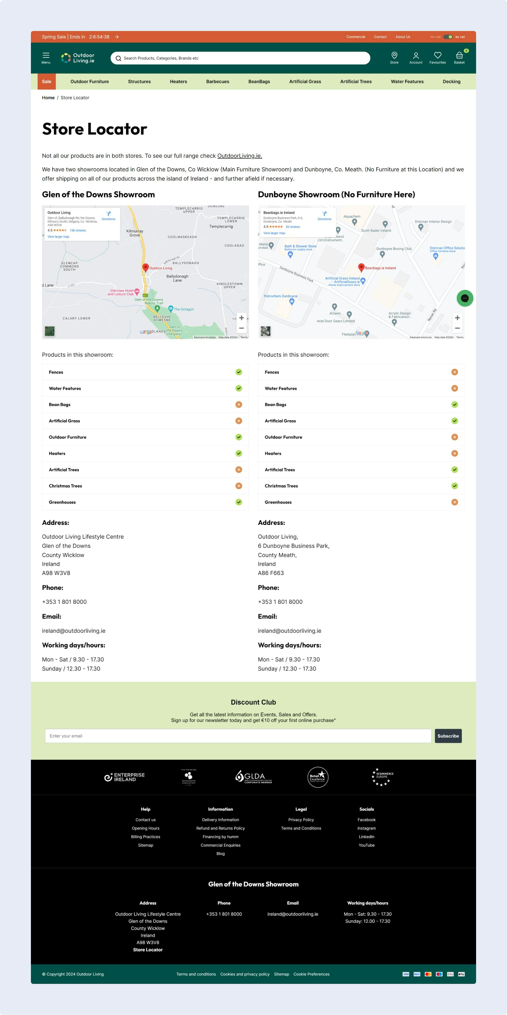 This interactive feature allowed customers to effortlessly find the nearest Outdoor Living location using a map interface. Detailed information for each store, including address, contact details, opening hours, and a list of product categories stocked, empowered informed decision-making.